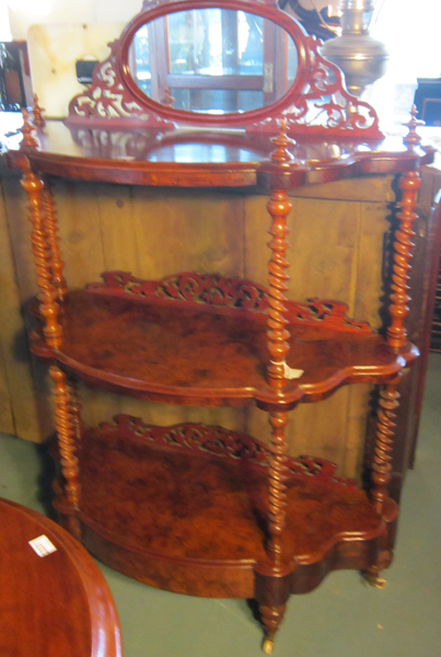 A 19TH CENTURY BURR WALNUT THREE SHELF WHAT-NOT, WITH AN OVAL MIRROR TO TOP, OPEN FRETWORK DECORATION, TURN SUPPORT CERAMIC CASTERS , 134 X 90 X 35