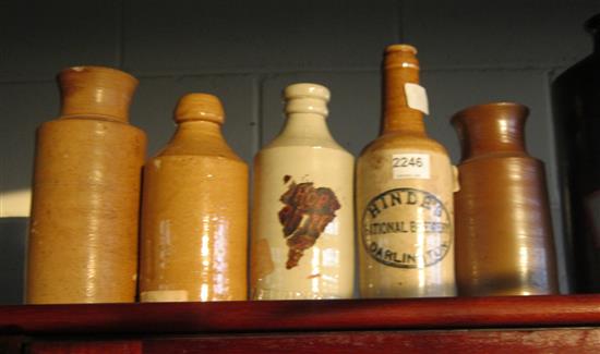 SIX VARIOUS STONE WARE JARS AND BOTTLES