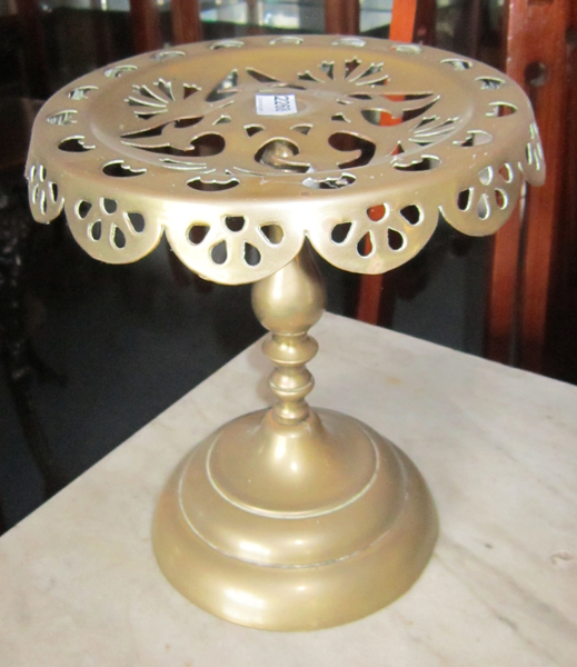 A VINTAGE BRASS COMPORT, WITH PIERCED DECORATION 45CM HIGH