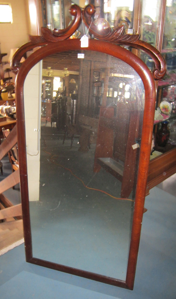 A MAHOGANY WALL MIRROR, WITH CARVED FEATURES, 140 X 72 CM