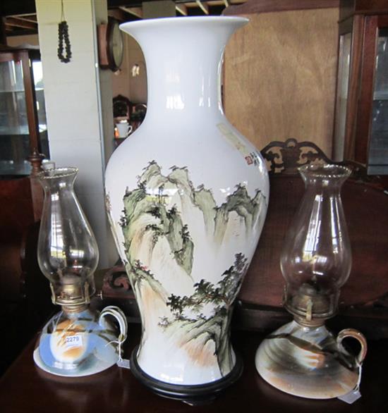 A PAIR OF POTTERY FINGER OIL LAMPS AND A LARGE ORIENTAL VASE WITH DAMAGE