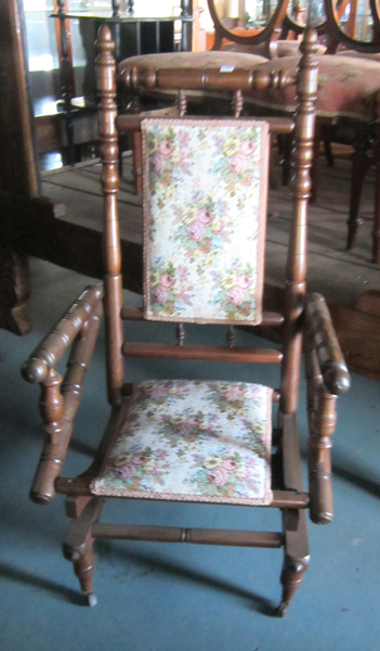 A VINTAGE ROCKING CHAIR, WITH TURNED FEATURES, UPHOLSTERED, STANDING ON CASTERS