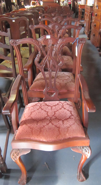 A SET OF EIGHT GEORGIAN STYLE DINING CHAIRS, SIX CHAIRS, TWO CARVERS, WITH DROP IN UPHOLSTERD SEAT