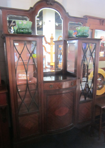 A SHERATON REVIVAL MIRROR BACK DISPLAY CABINET, WITH TWIN GLAZED DOOR THREE MIRRORS, CENTRAL DRAWER OVER A LOWER CUPBOARD, 206 X 120 X 36 CM