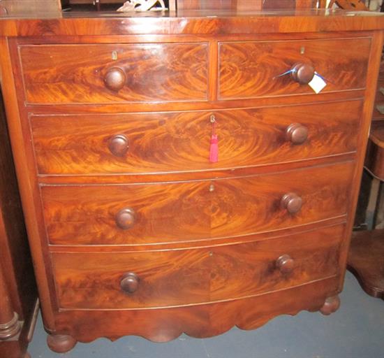 A 19TH CENTURY MAHOGANY BOW FRONT CHEST OF DRAWERS DRAWER, WITH TWO OVER THREE DRAWER SET, 114 X 120 X 54 CM