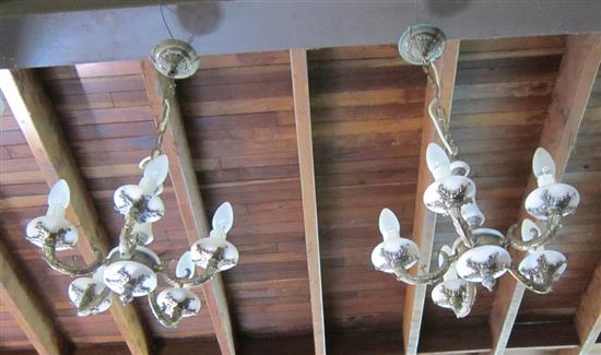 A PAIR OF VINTAGE FIVE LIGHT CEILING LIGHTS, WITH ORMOLOU MOUNTS