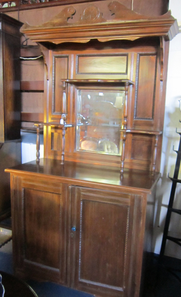 AN EARLY 20TH CENTURYSTAINED PINE MIRROR BACK SIDEBOARD, WITH CENTRAL MIRROR, TWO SHELVES AND TWO DOOR CUPBOARD TO BASE, 196 X 105 X 46