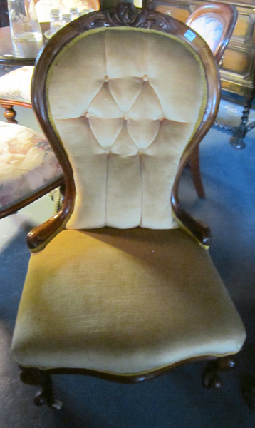 A 19TH CENTURY LADY'S CHAIR, CARVED BACK, BUTTON BACK UPHOLTERY, STANDING ON CERAMIC CASTERS