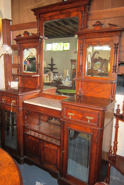 A 19TH CENTURY BURR WALNUT DRESSING TABLE WITH THREE MIRRORS TO TOP, TWO SHELVES, MARBLE INSERT TO CENTRE, TWO DRAWERS OVER TWO MIRRORED CUPBOARD DOORS AND GALLERY COMPARMENT AND CUPBOARD TO CENTRE, 212 X 250 X 40