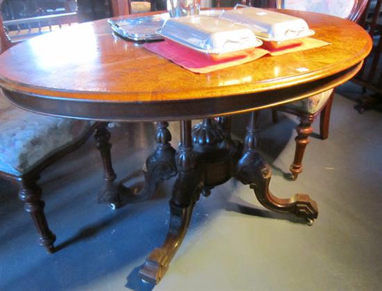 A 19TH CENTURY BURR WALNUT LOO TABLE, WITH DECORATIVE BASE, CERAMIC CASTERS, 170 X 80