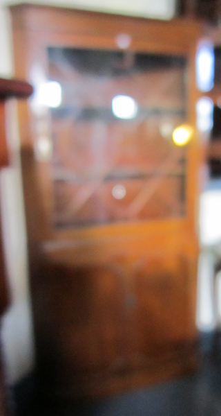 AN EARLY 20TH CENTURYWALNUT CORNER CABINET, WITH SINGLE GLAZED DOOR, TWO SHELVES AND A TWO DOOR CUPBOARD TO BASE, SOME LOSSES, 185 X 95 X 64 CM