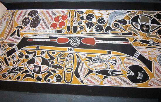 AN UNFRAMED ABORIGINAL PAINTING BY GAYILI MARIKA YUNUPINGU, WITH THE INFORMATION SHEET