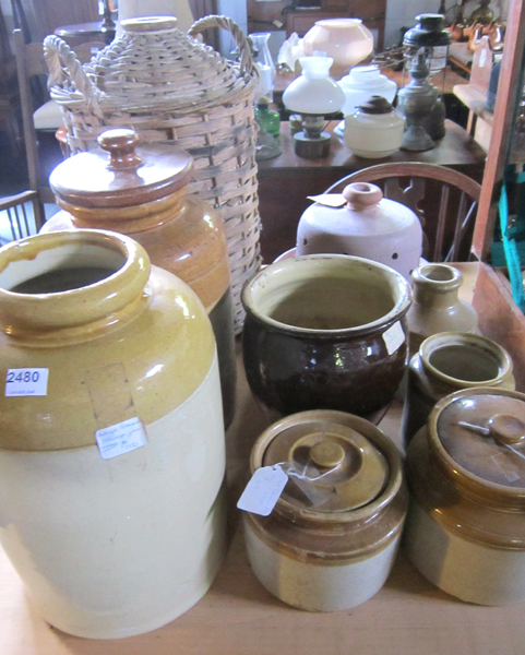 A SELECTION OF VINTAGE WARE POTS AND DEMI JONES