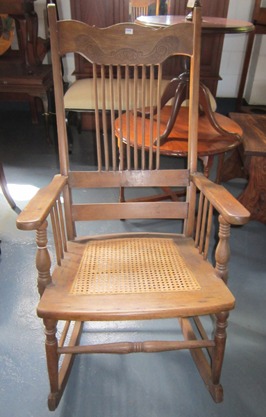 A VINTAGE ROCKING CHAIR WITH SPINDLE BACK AND RATTAN SEAT