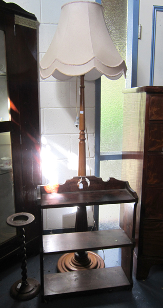 THREE PIECES OF WOODEN FURNITURE, STANDARD LAMP, WALL HANGING SHELVES, ASHTRAY