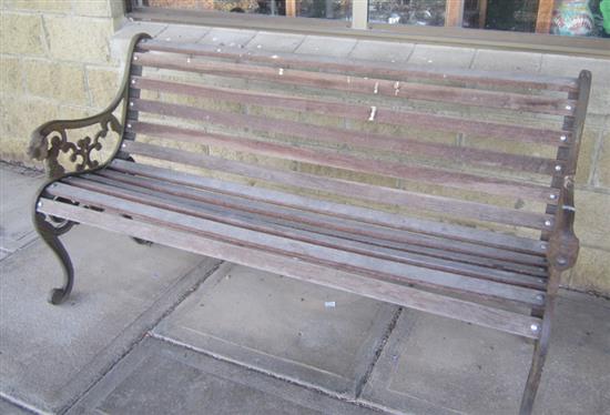 A CAST IRON FRAMED GARDEN SEAT WITH A SLATTED BACK AND SEAT, 143 CM WIDE