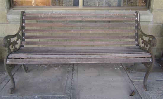 A CAST IRON FRAMED GARDEN SEAT WITH A SLATTED BACK AND SEAT, 143 CM WIDE