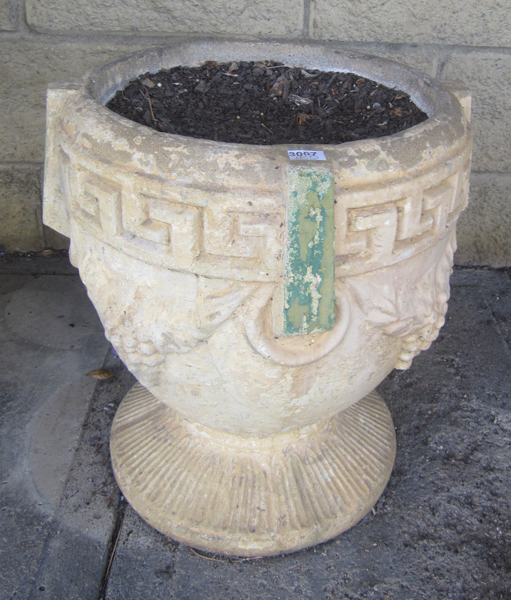 A PAIR OF CLASSICAL STYLE MOULDED CONCRETE URNS, 43 CM HIGH