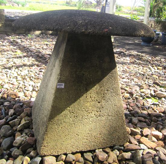 TWO RECONSTITUTED STONE GARDEN ORNAMENTS IN THE FORM OF MUSHROOMS, LARGEST 62 CM HIGH