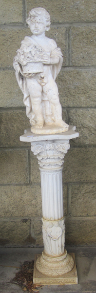 A PAINTED CONCRETE FIGURE OF A BOY RAISED ON A EARTHENWARE COLUMN PEDESTAL, 121 CM TOTAL HEIGHT