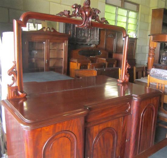 A VICTORIAN MAHOGANY THREE DOOR MIRROR BACKED SIDEBOARD, 150 X 181.5 X 56 CM