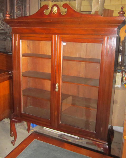AN EDWARDIAN STAINED PINE TWO DOOR CRYSTAL CABINET, 125.5 X 172 X 37.5