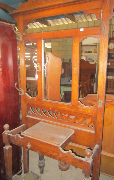 A 1930S OAK HALL STAND WITH SIX HAT HOOKS (ONE DETACHED) 86.5 X 202 X 30 CM