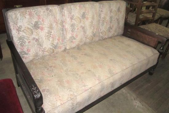 A JACOBEAN STYLE TWO SEATER SETTEE WITH A CANE BACK AND SIDES (SOME DAMAGE), 153 CM WIDE