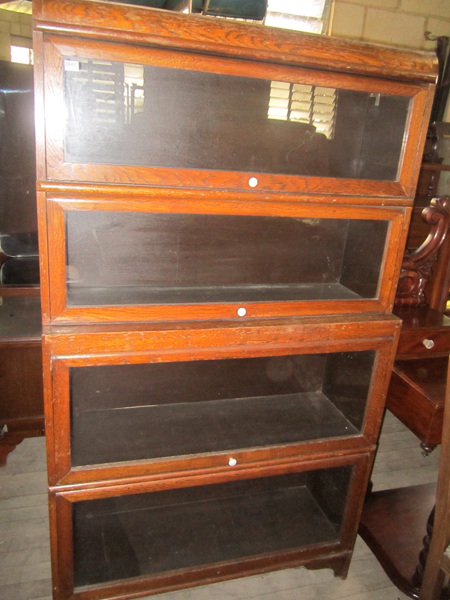 AN EARLY 20TH CENTURY OAK WATERFALL BOOKCASE WITH FOUR GLAZED DOORS, 87.5 X 153.5 X 30 CM