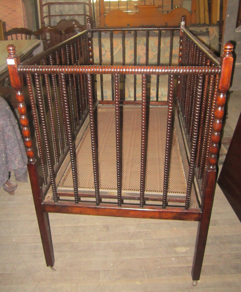 A PATENT AUTO COT WITH A REEL TURNED FRAME ON CASTORS, 136.5 X 114 X 75.5 CM