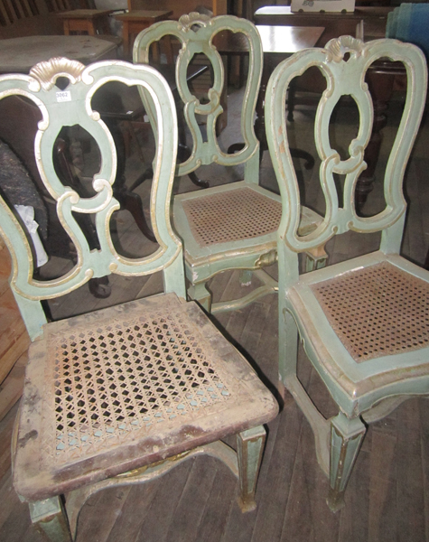 A SET OF THREE POLYCHROME PAINTED DINING CHAIRS, PROBABLY ITALIAN, WITH CANED SEATS (ONE CHAIR LACKING THE CANING)