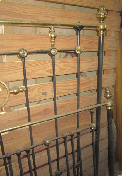 A BLACK ENAMELLED AND BRASS DOUBLE BED HEAD AND FOOT