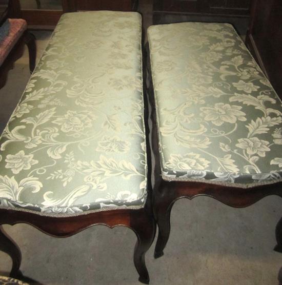 TWO HARDWOOD FRAMED STOOLS WITH FLORAL UPHOLSTERY, 142 CM AND 112 CM LONG