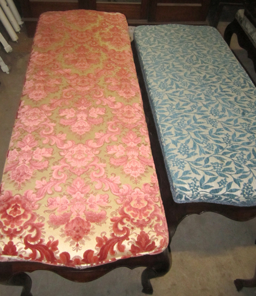 TWO HARDWOOD FRAMED STOOLS WITH FLOCKED FLORAL UPHOLSTERY IN TEAL AND RED, 116 CM AND 144 CM LONG