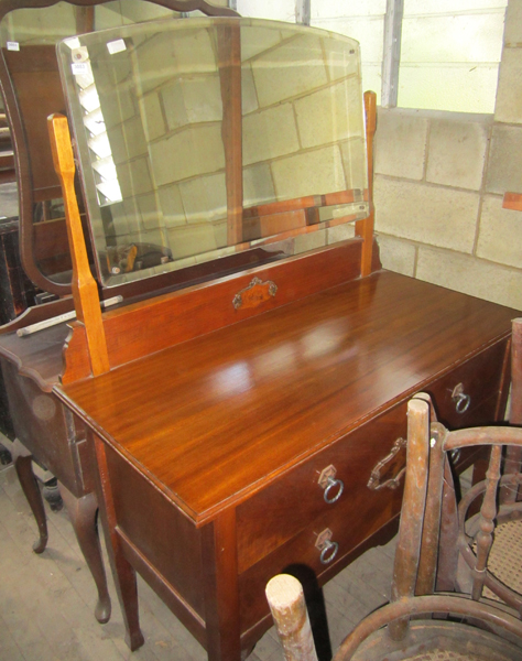 A HARDWOOD MIRROR BACK TWO DRAWER DRESSING TABLE, 106 X 147.5 X 50 CM