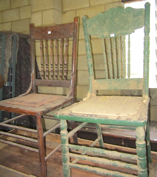 A COLLECTION OF THREE PRESS BACK DINING CHAIRS, ONE PAINTED GREEN (UNRESTORED CONDITION)