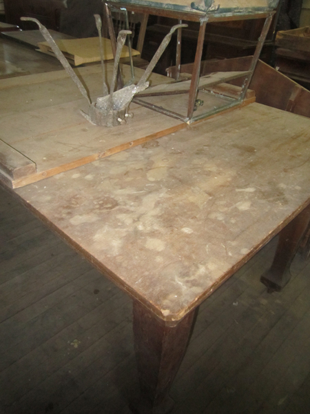 A RUSTIC HARDWOOD KITCHEN TABLE, 106.5 X 75 X 137 REPLACED TOP, WATER DAMAGE, UNRESTORED CONDITION