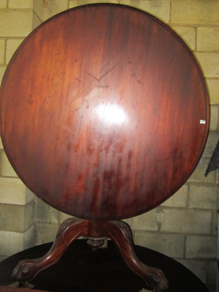 A 19TH CENTURY CEDAR CIRCULAR TOP TABLE WITH A SCROLL TRIPOD BASE, 106 CM DIAMETER X 72.5 CM HIGH