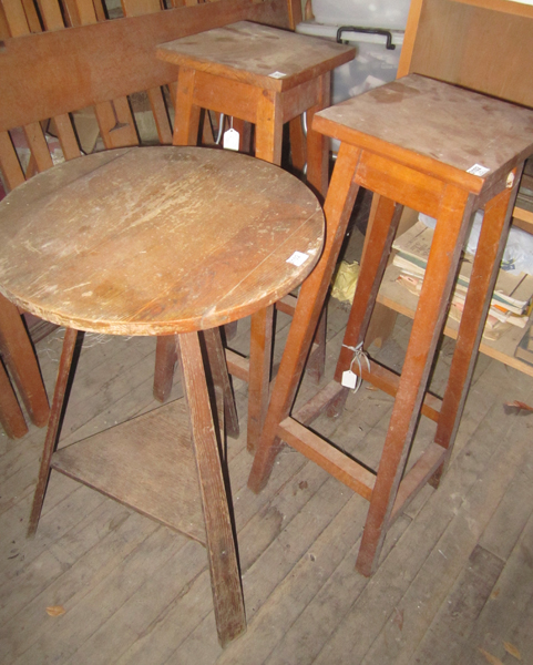 TWO KAURI PINE STOOLS AND AN OAK OCCASIONAL TABLE