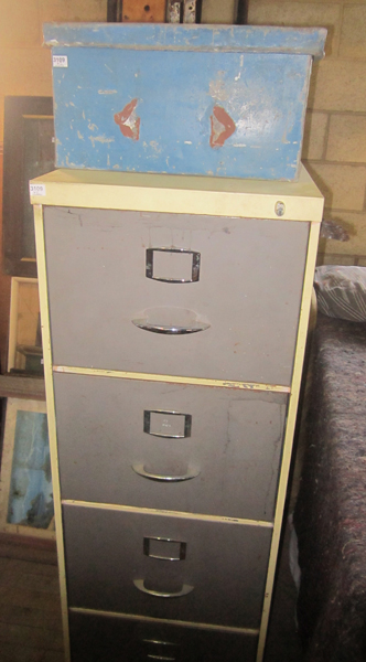 A FOUR DRAWER FILING CABINET AND A BLUE PAINTED TIN BOX