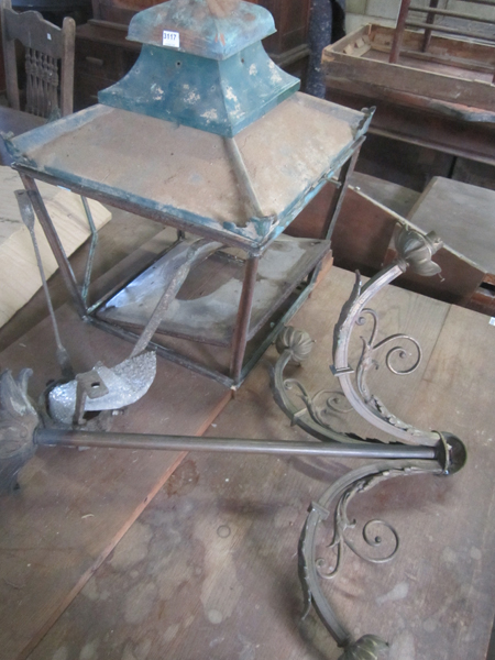 A PAINTED COPPER LANTERN AS FOUND AND A BRASS TREE BRANCH CEILING LIGHT