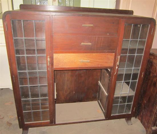 AN ART DECO SIDE CABINET WITH TWO GLAZED DOOR AND THREE DRAWERS (UNRESTORED) INCOMPLETE, 117.5 X 119.5 X 31