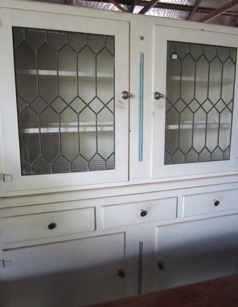 A RUSTIC WHITE PAINTED KITCHEN DRESSER WITH LEADLIGHT GLAZED DOOR AND THREE DRAWERS (UNRESTORED), 131.5 X 163.5 X 35 CM