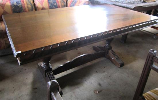 AN OAK SOLID TOP DINING TALE WITH A STRETCHER BASE, 166 X 77 X 102