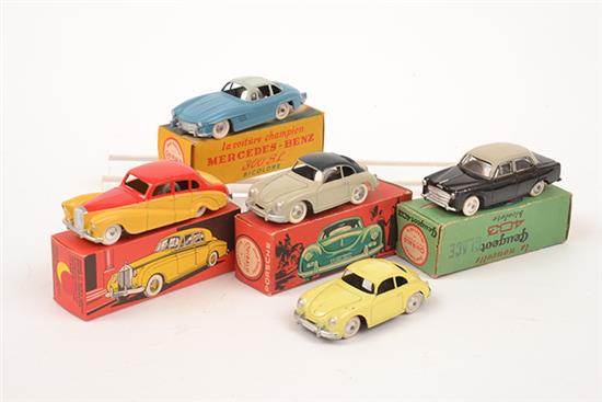5 QUIRALU MODELS INCLUDING PEUGEOT 403, TWO TONE; PORSCHE COUPE, TWO TONE; MERCEDES 300SL TWO TONE; REISSUE ROLLS ROYCE SILVER CLOUD TWO TONE; AND ONE UNBOXED PORSCHE COUPE IN GOOD CONDITION (E-M BOXES VG-M) (5)
