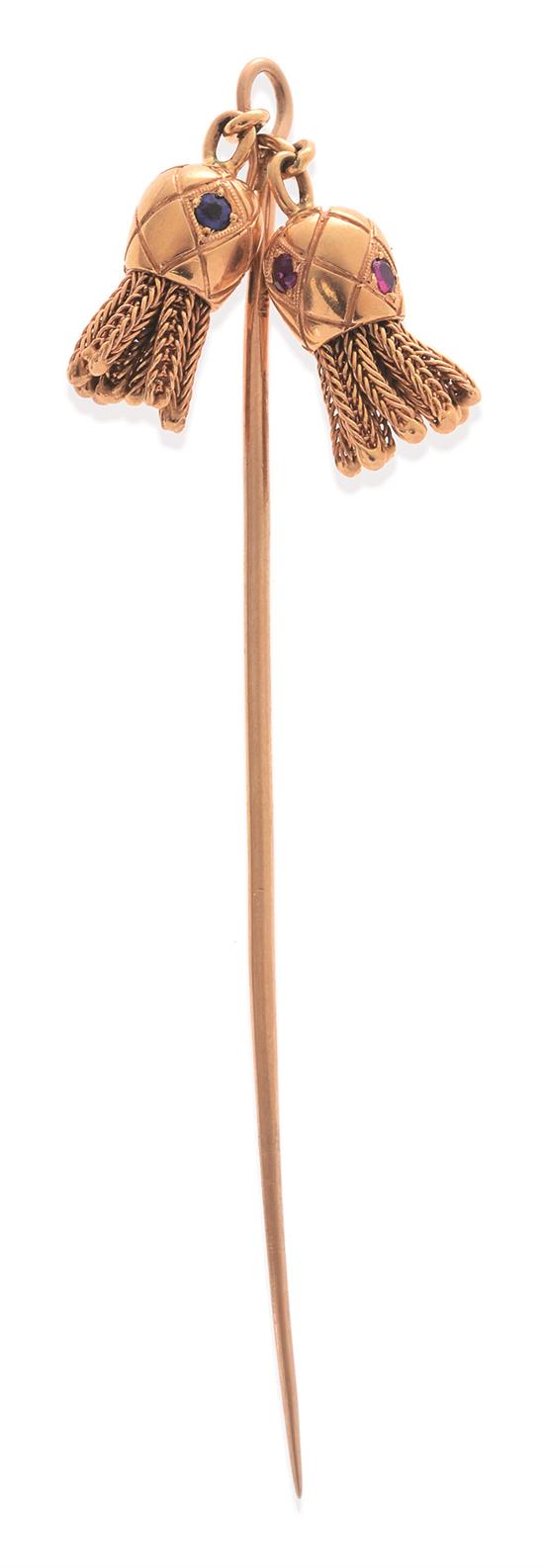 Comprising two finely detailed tassels, one ruby set and one sapphire set, in 18ct gold.
