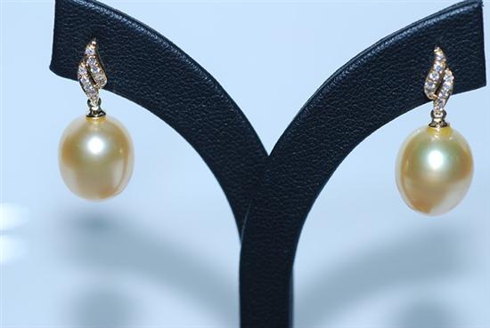 A PAIR OF GOLDEN SOUTH SEA PEARL AND DIAMOND EARRINGS TO POST AND BUTTERFLY FITTINGS