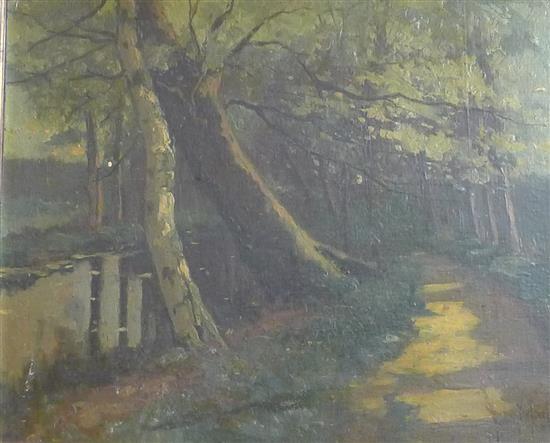 SIGNED ILLEGIBLY LOWER RIGHT, PATH THROUGH THE FOREST, 1921, OIL ON CANVAS BOARD, 40 X 48CM