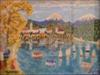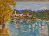 SAM BYRNE, BOATS AND VILLAGE, MIXED MEDIA ON BOARD, 14.5 X 19.5CM