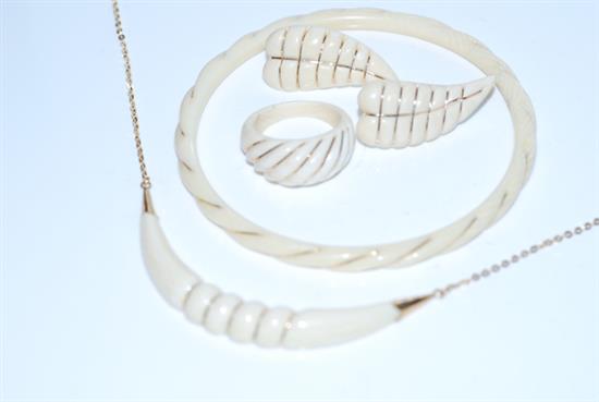 A SUITE OF IVORY JEWELLERY INCLUDING RING, BANGLE AND EARRINGS